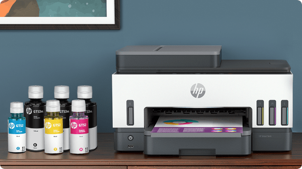 Black and composite color average per bottle (cyan/magenta/yellow) results based on HP methodology and continuous printing of ISO/IEC 24712 test pages. Not based on ISO/IEC 24711 test process. An additional black ink bottle is required to print 8000 color test pages. Actual yield varies based on content of printed pages and other factors. Some ink from included bottles is used to start up the printer. For more information about fill and yield, see www.hp.com/go/learnaboutsupplies. - HP Smart app: